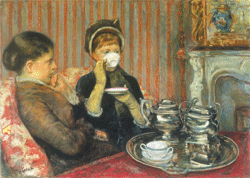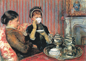 <下午茶>是很典型卡莎特式居家生活的描繪,兩名女子喝著下午茶,這是很常見的社交場合。就像其他的印象派畫家一樣,她也捕捉到了一個重要的瞬間動作──其中一位太太正優雅的小口啜飲著