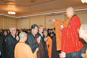 典禮當天,只見中天寺殿內外擠滿十方信眾,以虔誠之心恭請星雲大師為大眾盟證授戒。大師一一引領大家懺悔發願,願從今後,皈依佛、法、僧三寶;受五戒者更發願受持不殺生、不偷盜、不邪淫、不妄語、不飲酒等戒律。