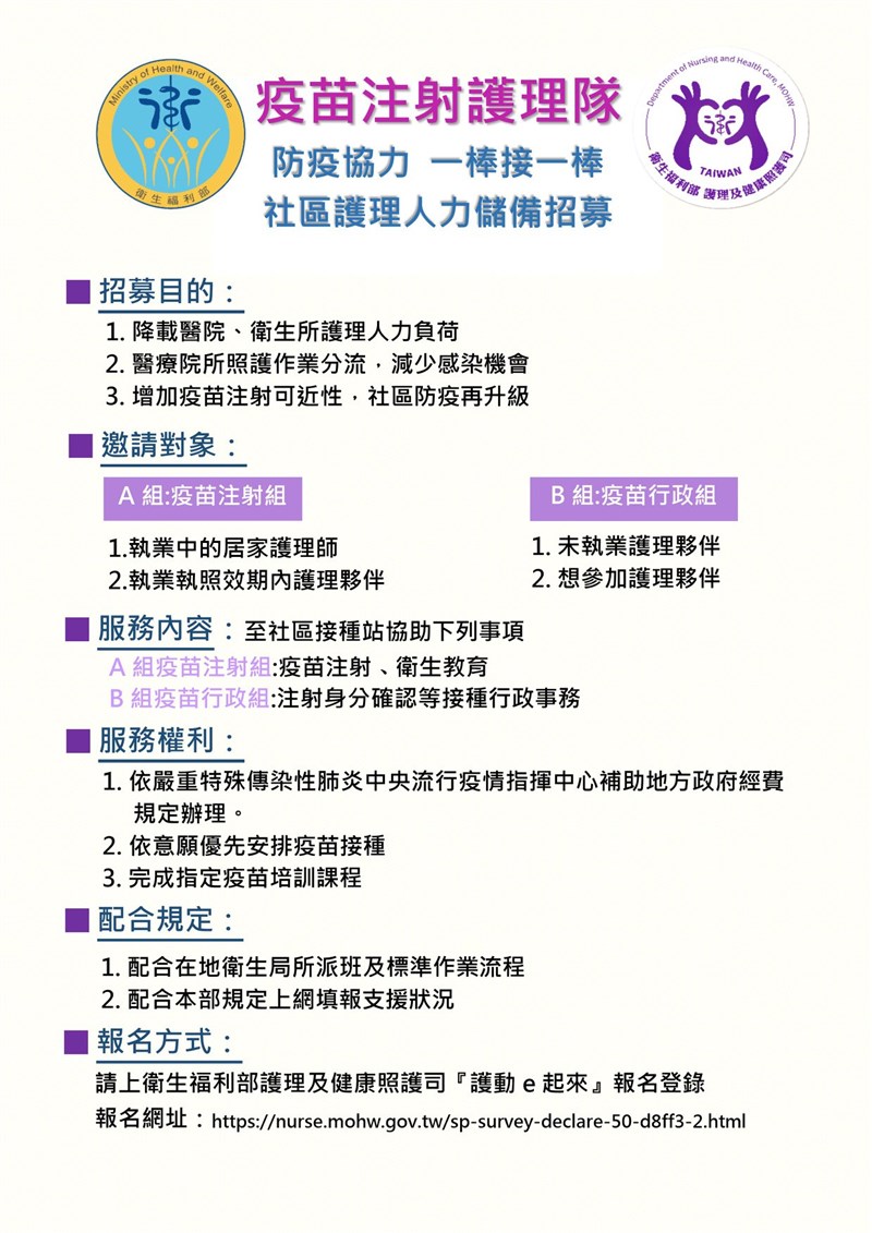 至於服務權利,衛福部說,將依中央流行疫情指揮中心補助地方政府經費規定辦理,且依意願優先安排疫苗接種,並完成指定疫苗培訓課程。這次注射護理招募將配合在地衛生局派班及標準作業流程,配合衛福部規定上網填報支援狀況。