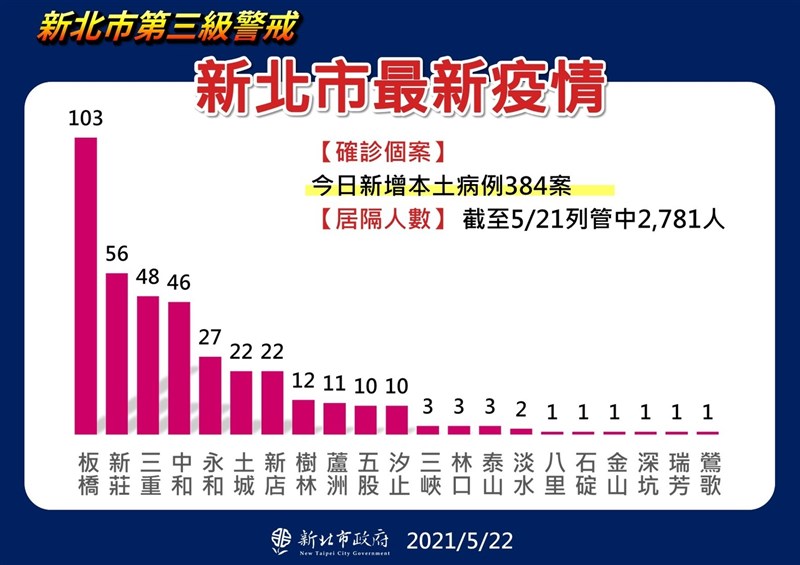 【本報新北訊】中央流行疫情指揮中心今(22日)公布確診與校正回歸個案,新北市384例最多,又以板橋區103例為多,新北市衛生局表示,依指揮中心修訂記者會個案資料發布原則,即日起不再每天公布確診個案足跡。