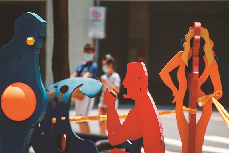 台北市一棟大樓外的戶外裝置藝術昨日被拉起封鎖線,避免民眾靠近,盼減少接觸傳播風險。圖╱中央社
