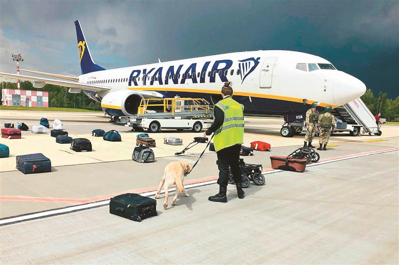 瑞恩航空客機轉降明斯克後,立即派員檢查行李。圖/法新社