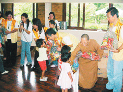 永宜法師、覺信法師、菲律賓協會執行副會長李雄才及馬二分會幹部會員,用愛與關懷緊緊擁抱著這群孩子,孩童則用他們的笑容和歌聲回報佛光人的熱情。