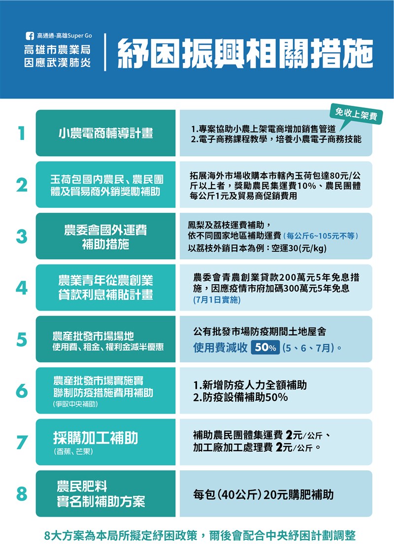 8大紓困方案包括小農電商輔導、玉荷包內外銷獎勵、青年農民創業貸款利息補貼、農產批發市場使用費減半、香蕉芒果採購加工補助、農民肥料實名制補助等。