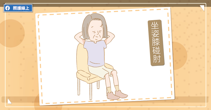 坐姿膝碰肘身體坐直,雙手放在耳後,抬起左大腿,身體扭轉,讓左側膝蓋與右手手肘相碰;放下左腿,身體轉正,再換邊改成抬起右膝蓋,扭轉身體讓右膝與左手手肘相碰。交替進行。你也可以用「手碰腳」,把左腳往上踢,以右手觸碰腳尖處,並換邊執行。
