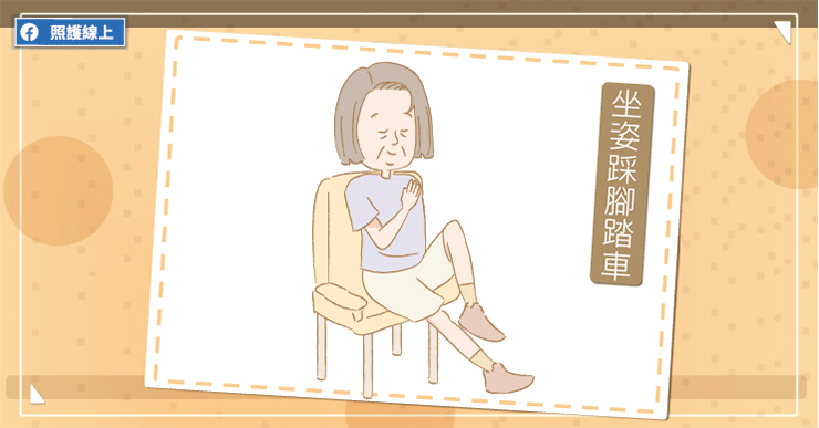 坐姿踩腳踏車身體坐直,微微向後傾,雙手撐在椅子上幫忙保持平衡,讓大腿離開椅面,開始像踩動腳踏車般動著雙腳。