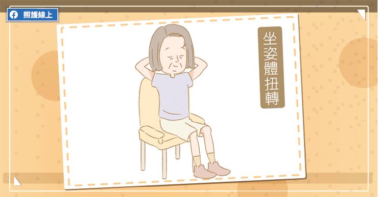 坐姿體扭轉身體坐直,雙手放在耳後,腳踩穩不動,扭轉軀幹到左側,再扭轉身體到右側。