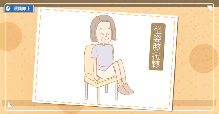 坐姿膝扭轉身體坐直,雙腳併攏彎曲,大腿離開椅面,身體不動,將併攏的雙腳移往左邊,再移往右邊,交替進行。也可以將雙腳併攏抬起到與地面平行,再做扭轉。