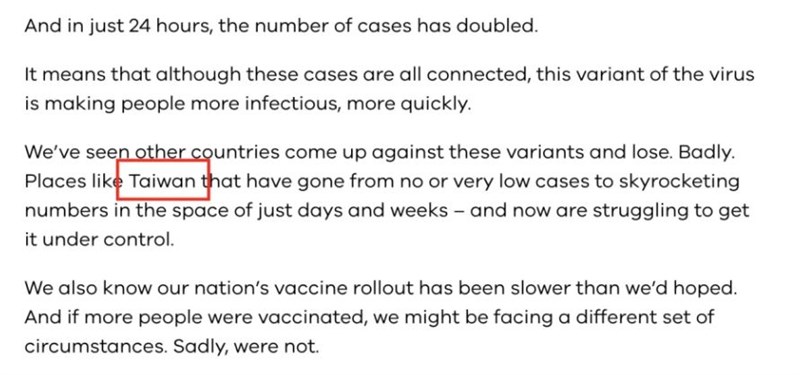 澳洲政府表示,只有從事社會必要性工作、就醫、採購生活用品、以及接種疫苗時才能外出。維多利亞州墨爾本政府當局發出的聲明中提及台灣,指出台灣從0到大爆發僅有幾天時間,強調必須當機立斷,「為避免像台灣那樣一發不可收拾」,儼然將台灣的案例當作教訓。