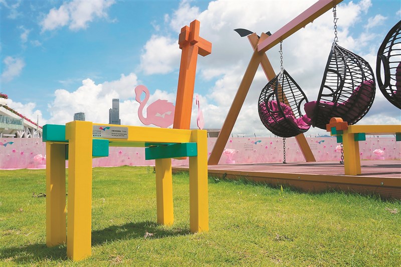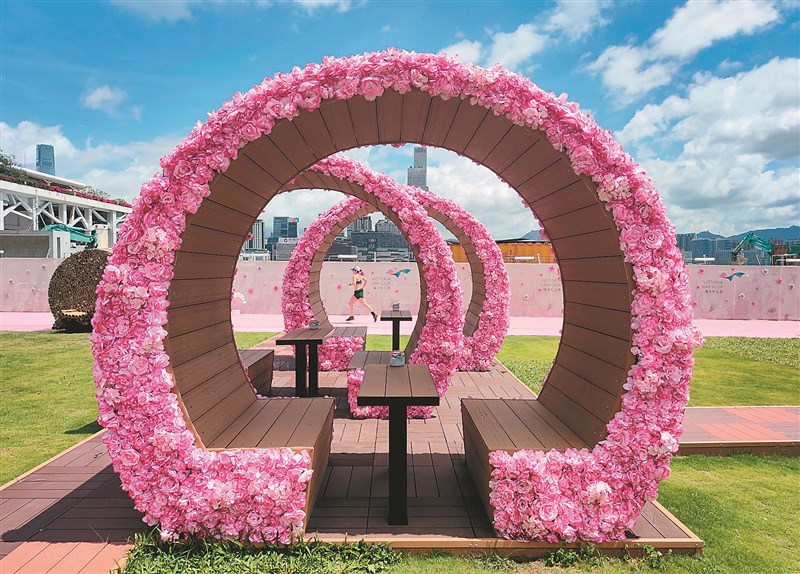 毗鄰香港灣仔渡輪碼頭的海濱主題區「HarbourChill海濱休閒站」昨日對外開放。這是由專業人士參與營造的海濱實驗空間,原為大型基建工程用地,占地面積約1800平方公尺,以城市後花園為主題,在草坪上設置各式各樣的蔭棚、座椅和鞦千,以綠色、粉色為主色調,營造出柔和溫馨氛圍。圖為設計師用木條組合成五款可移動的動物家具、粉色玫瑰裝飾的拱形蔭棚。圖/中新社