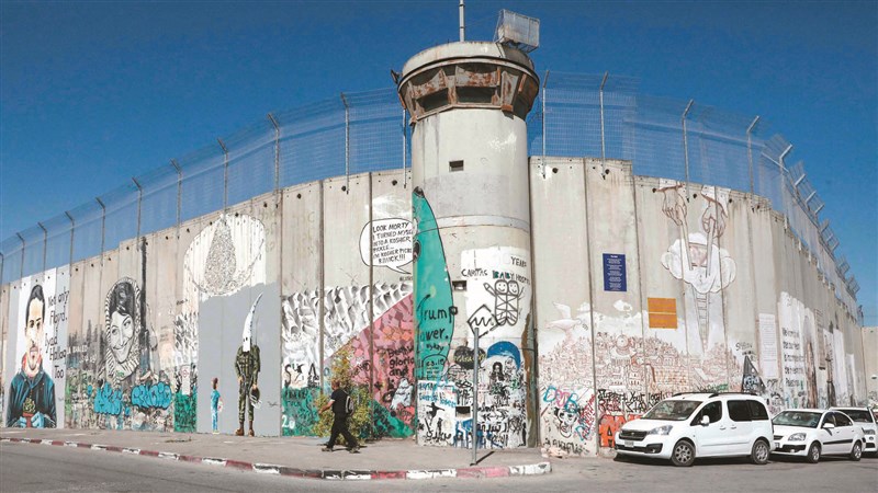一名男子五月三十日行經伯利恆的以色列隔離牆,牆上有巴勒斯坦藝術家塔奇‧斯巴汀畫的壁畫,畫上是一名拿著碗的男孩及一名三K黨裝扮的以色列警察。以色列為隔離巴勒斯坦人,在約旦河西岸地區築起這道惡名昭彰的高牆。圖/法新社
