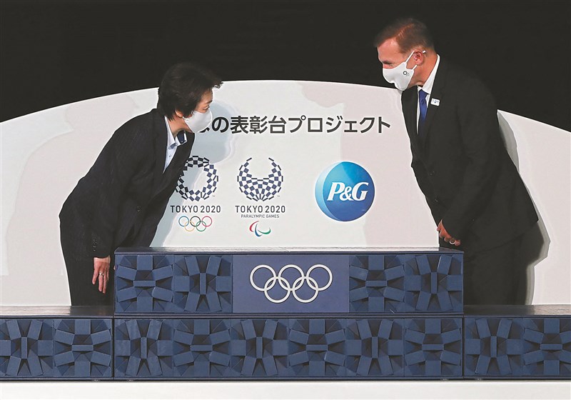 橋本聖子(左)昨天出席東京奧運的相關活動,展示將用於頒發的獎牌、頒獎台和配樂。圖/法新社