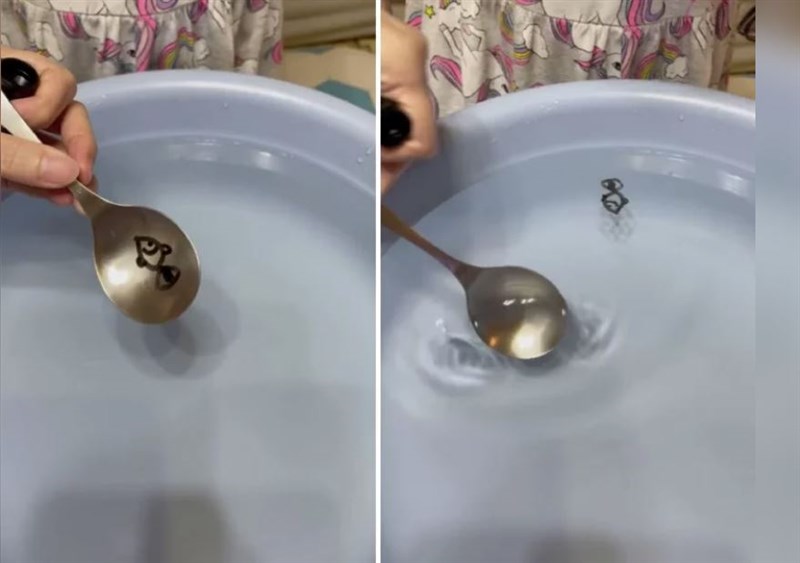 原PO在臉書社團「爆廢公社」發文分享,只要準備一隻水性白板筆、鐵湯匙以及能裝下一定容量的水盆,接著在鐵湯匙上畫出魚的圖案,待墨水乾掉後,將湯匙放入水中,就能看到原本畫在湯匙上的魚慢慢脫落並浮在水面上,好似活了起來。
