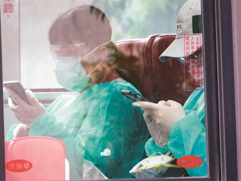 快篩呈陽性反應者,須上公車送檢疫,一上車就忙著通知家人。圖╱邱德祥
