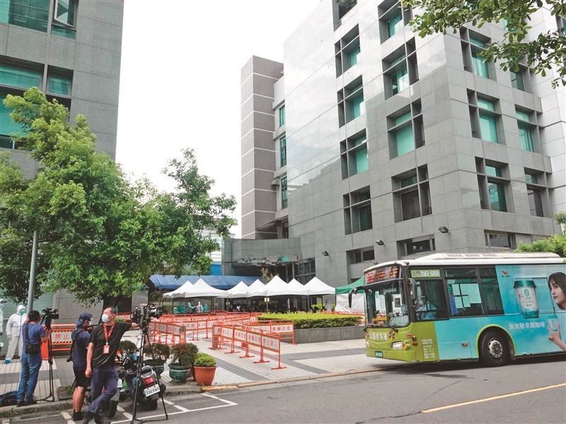 台北市內湖區壹電視大樓七日發現一名攝影師猝死廁所,證實確診新冠病毒。壹電視昨天在公司中庭設置快篩站,協助全體員工快篩。圖╱邱德祥