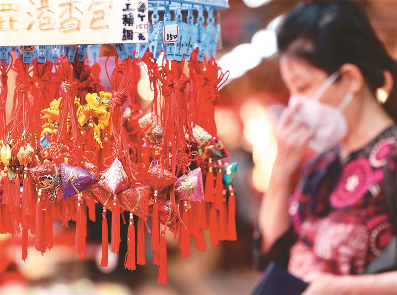 端午節連續假期到來,台北市南門市場店家販售香包等應景商品,為疫情下的生活增添不少節日氣氛。圖/中央社