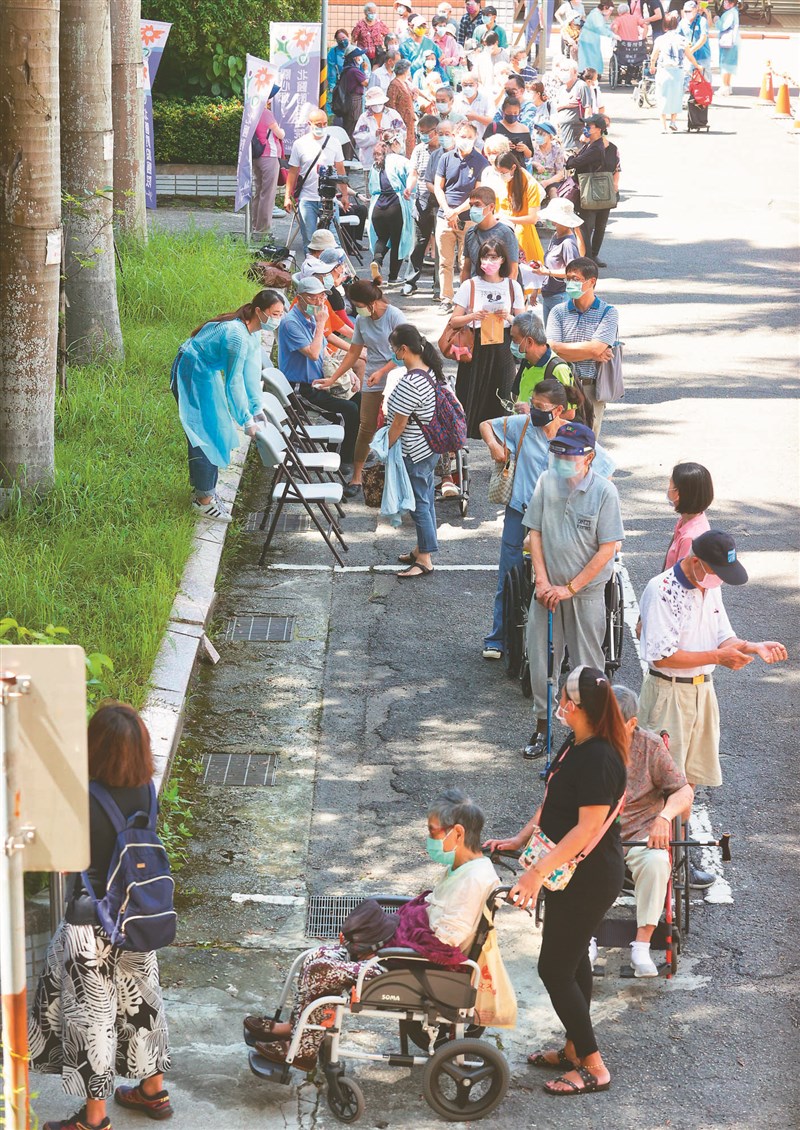 設在台北市信義國中的新冠疫苗社區接種站,一早就有許多長者排隊。圖╱中央社