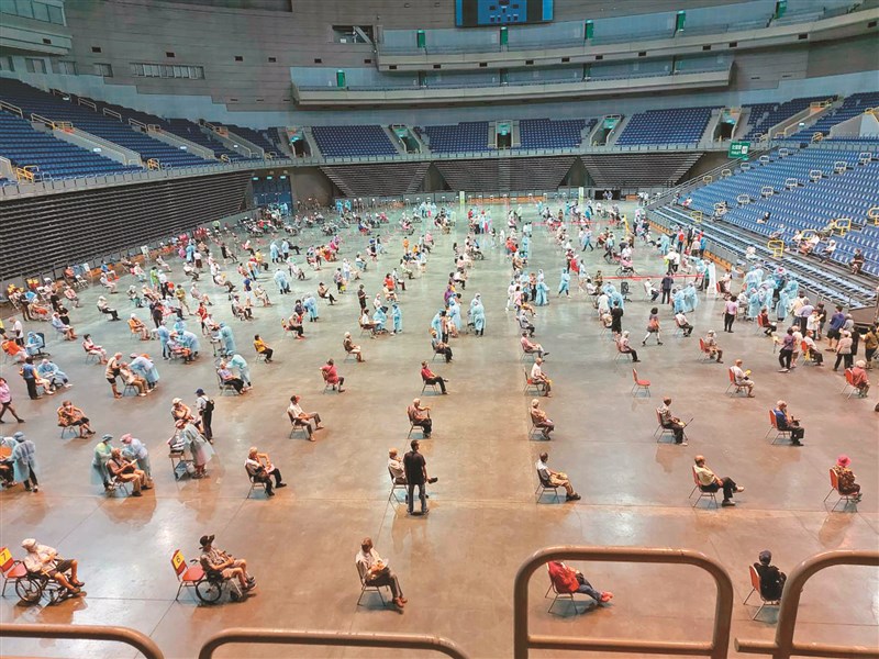 昨日首波長輩新冠疫苗接種,高雄市為確保人員安全距離,將通道間隔再加寬為三公尺。圖╱中央社