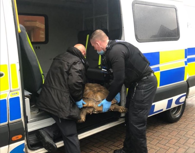 英國一隻35歲烏龜「離家出走」,最後在距離1.6公里的街上被尋回,兩位員警幫忙載回。圖/取自Twitter「Ipswich Police」