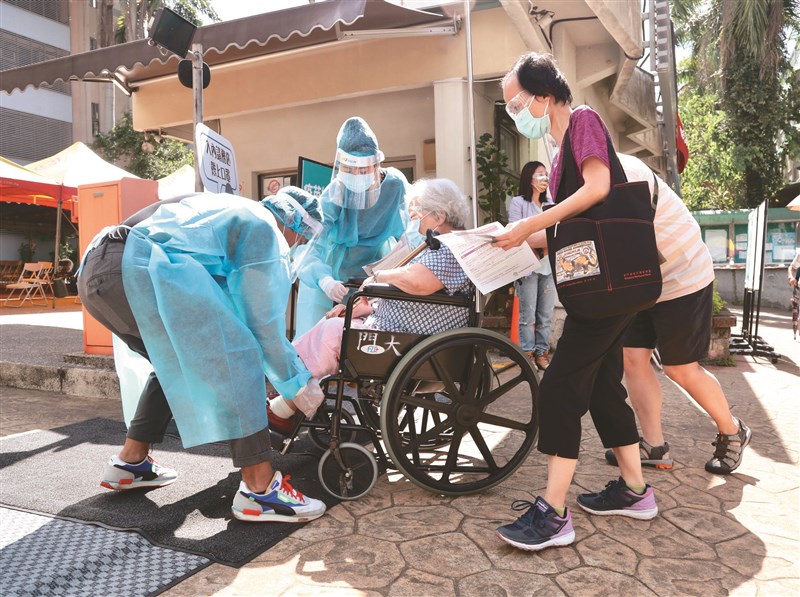 台北市萬芳醫院在萬芳高中設置接種站為長者施打AZ疫苗,昨日醫護人員協助長者移動輪椅,前往問診區。圖╱中央社