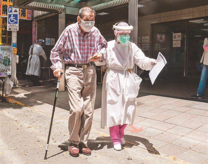 台北市西園醫院昨日醫護人員攙扶獨自前來的長者到注射區。圖╱中央社