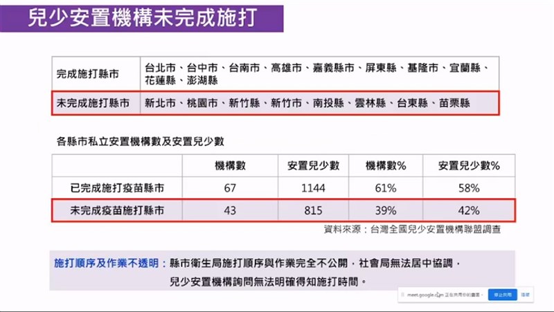 安置盟指出,尚有815個孩子沒有施打疫苗,原因是部分縣市政府與中央不同調。圖/記者李祖翔翻攝官方粉絲頁