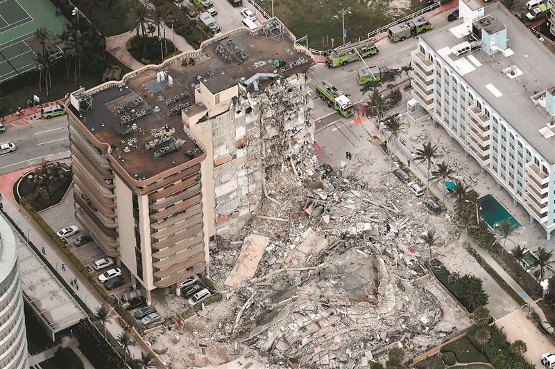 【本報綜合外電報導】美國佛羅里達州邁阿密海灘(Miami Beach)附近一棟十二層樓高、屋齡四十年的尚普蘭大廈南棟康斗公寓(condominium),二十四日凌晨約一時三十分發出轟隆巨響後,建築物一側整個坍塌;造成至少四人死亡,百餘人失蹤,搜救行動持續進行中,倒塌原因仍有待調查;救難人員在大約兩層樓高的瓦礫堆中,尋找仍有倖存者生命跡象的蛛絲馬跡。