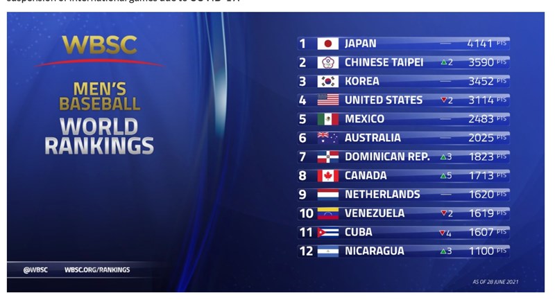 雖獲得史上最佳的世界排名,但中華隊卻因新冠病毒疫情影響,退出東京奧運棒球資格賽,是世界排名前5名、唯一無緣東奧的國家。