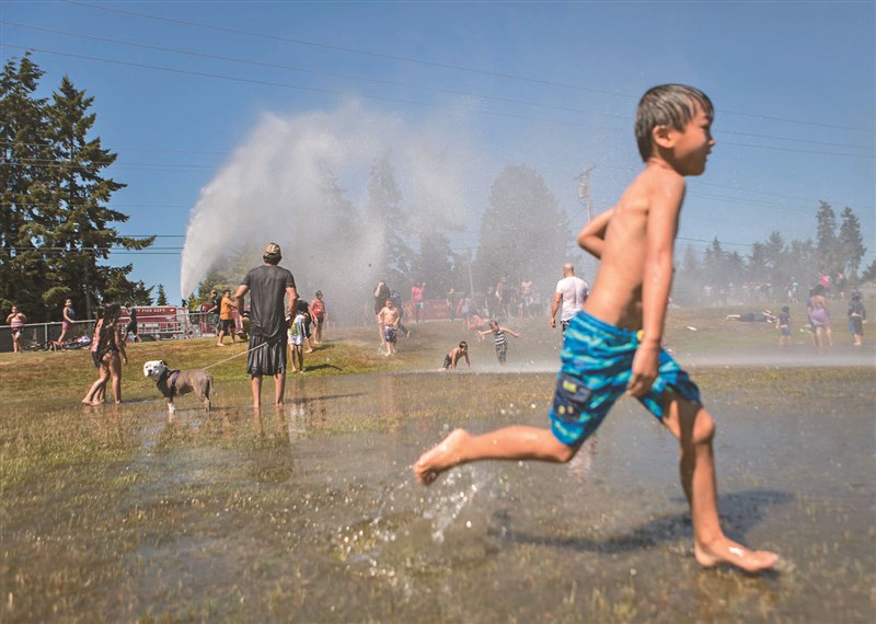 美國西北部遭熱浪侵襲,華盛頓州艾弗雷特消防局26日用消防水龍噴水,讓民眾戲水消暑。圖/美聯社