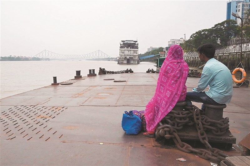 印度加爾各答的通勤者,在大眾運輸受到限制後,雨中等待乘坐渡輪。