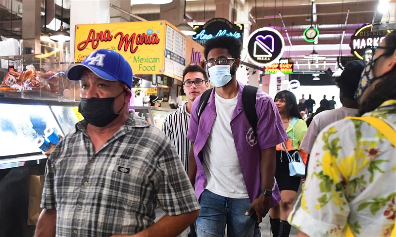 Delta變種肆虐,美國前7天確診病例增加了10%。圖為30日洛杉磯中央市場內的採買人潮。法新社