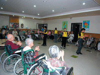 佛光山慈悲基金會主辦、佛光會板橋區各分會承辦的「廣權護理之家‧慈善慰問」活動,三日,在南雅、土城分會會長林碧霞、盧仁雄帶領下,邀請擔任台北縣國際生命線義工的好朋友加入關懷行動,帶來熱情民族舞蹈外;林會長藉由教唱佛曲,以拍手功帶動長者運動,並摺出可愛的氣球娃娃、氣球貴賓狗,送給每位老菩薩結緣。同時佛光幹部,也為長者按摩、活絡筋骨、加油打氣,給予濃濃的關愛與歡樂,令長者非常感動。