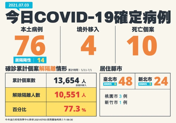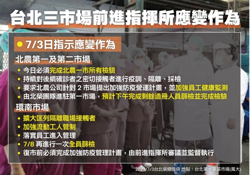 北市3大果菜市場篩檢逾2百例確診 7/8全員工復檢 |2021.07.03 語音朗讀 1890觀看次 字級 大 中 小 北農採檢分10線同步進行。圖/北榮提供 【本報台北訊】台北市環南市場市場爆出41例陽性確診個案,北市及中央成立聯合指揮所,並指揮北榮、北市聯醫及亞東針對3市場進行擴大篩檢,北榮今天(3日)要篩2000人。中央流行疫情指揮中心指揮官陳時中指出,目前初步了解篩檢結果,第一市場有88例、第二市場21例、環南市場111例。但有部分數字仍需要訂正,再另行報告。針對台北3市場前進指揮所應變作為,陳時中指出,昨日已針對環南市場周邊發送8萬則疫情警示簡訊,另設置環南篩檢站,並於已於今天上午8時開始篩檢,現已完成環南40例、北農5例新增確診者疫調,正進行環南40例確診個之接觸者,共183人列及居家隔離,目前北農第一市場採驗約2600人,其中有6例陽性個案中,有3例為舊案,尚餘400多人檢驗中。陳時中說,「這些確診個案,會先讓他隔離開,再安排採檢,希望能把傳播鍊斷掉。」台北3大果菜市場前進指揮所今日起,必須完成北農一市所有檢驗,持續對後續確診者之密切接觸者進行疫調、隔離、採檢,要求北農公司針對2市場提出加強防疫營運計書,並加強員工健康監測。另外由北榮團隊進駐第一市場,預計下午完成剩餘造冊人員篩檢並完成檢驗。而環南市場將擴大匡列隔離職場接觸者,包含加強流動工人管制、落實員工進入管理,並於7月8日再進行一次全員篩檢,復市前必須完成加強防疫管理計畫,由前進指揮所審議並監督執行。北市及中央成立聯合指揮所,並指揮北榮、北市聯醫及亞東針對三市場進行擴大篩檢。圖/指揮中心提供●屏東社區採檢 PCR全陰性受Delta變種病毒侵襲的屏東疫情趨緩今天+0,陳時中表示,社區篩檢應該告一段落,這幾天連續5天測兩千多人,PCR也都陰性,共採12744名社區採檢,PCR全陰性。屏東今天沒有新增案例,陳時中說,這一波若採驗完畢,隔離裡面也不用擔憂,非隔離者有就要進一步匡列。可以說社區安全,相關接觸者可以採檢完成,可以告一段落,最後一個接觸日是6月27日,要到7月11日監測完畢。●本土新增76例 10例亡今日新增80例新冠確定病例,分別為76例本土及4例境外移入;另確診個案中新增10例死亡。陳時中指出,整體做了大規模篩檢,案例數會偏高,但疫情仍往下,扣掉這兩天居隔解陽者,個案數仍少。圖/指揮中心提供指揮中心表示,今日新增之76例本土病例(其中14例為居隔解陽),為 31例男性、45例女性,年齡介於未滿5歲至70多歲。個案分布台北市48例、新北市24例、桃園市3例、新竹市1例;其中55例為已知感染源、21例調查中,相關疫情調查持續進行中。指揮中心說明,今日新增10例死亡個案,為5例男性、5例女性,年齡介於50多歲至90多歲,發病日介於5月21日至6月30日,確診日介於5月29日至7月2日,死亡日介於6月26日至7月2日。指揮中心指出,近期確診個案解隔離情形,5月11日至7月1日累計公布1萬3654位確診個案中,已有1萬551人解除隔離,解隔離人數達確診人數77.3%。 前一篇文章 PLG/林宜輝加盟攻城獅 盼與高國豪聯手奪冠 下一篇文章 日本靜岡嚴重土石流 數間民宅被吞噬逾20人失蹤 熱門新聞 01房市冷 仲介業跨足都更危老整合2026.02.2102動物的精采瞬間(下)2026.02.2203朝山叩鐘 佛光山嶄新大雄寶殿迎春 2026.02.2104佛光山平安燈會 逾百萬人朝聖2026.02.2305【詩】紅豆控的紅龜粿2026.02.2306Q版初代超人力霸王 領航愛河灣2026.02.2107【印象旅人】烘爐地南山福德宮 踏青行2026.02.2108台北道場 新春禮千佛2026.02.2109南投燈會 佛光山鳳凰主燈傳送光明2026.02.2110佛光好市集 職人蔬食、極致咖啡 匯聚佛光大道2026.02.21 訂閱電子報 台北市 天氣預報 台灣一週天氣預報 相關報導 韓:總統願赴立院國情報告金門機場候補數百人 軍機連2天疏運七股科技工業區 招商有成春節連假 海軍維安總統登小雪山拜年 談話聚焦國防經濟蘭嶼巡防艦交船