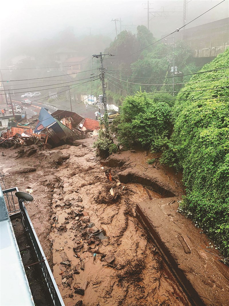 日本靜岡縣因梅雨滯留鋒面影響降下大雨,三日上午熱海市伊豆山地區發生土石流,造成十多棟房屋被沖毀,至少二十人失蹤,目前已尋獲兩人但心肺停止。圖為當地居民拍攝的災區現場。圖/法新社