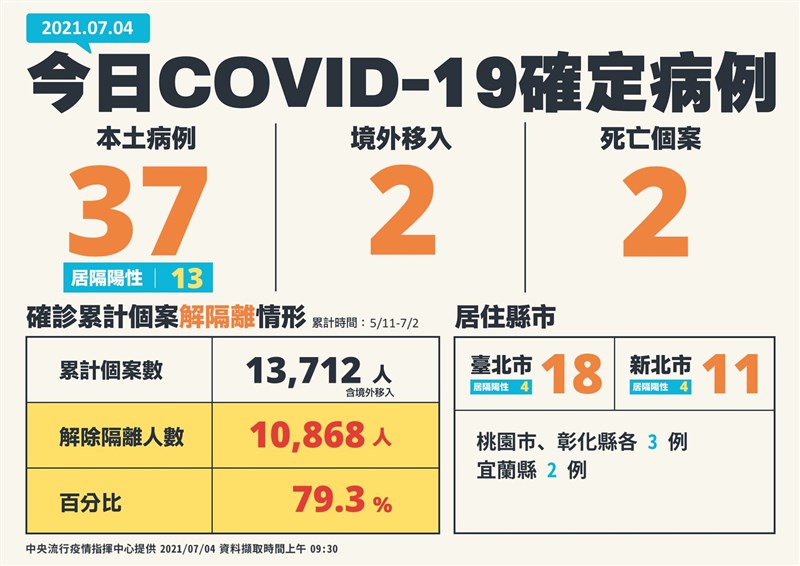 新增37例本土病例(13例居隔解陽),為12例男性、25例女性,年齡介於未滿5歲至90多歲。個案分布台北市18例、新北市11例、桃園市及彰化縣各3例、宜蘭縣2例;其中16例為已知感染源、3例關聯不明、18例調查中,相關疫情調查持續進行中。
