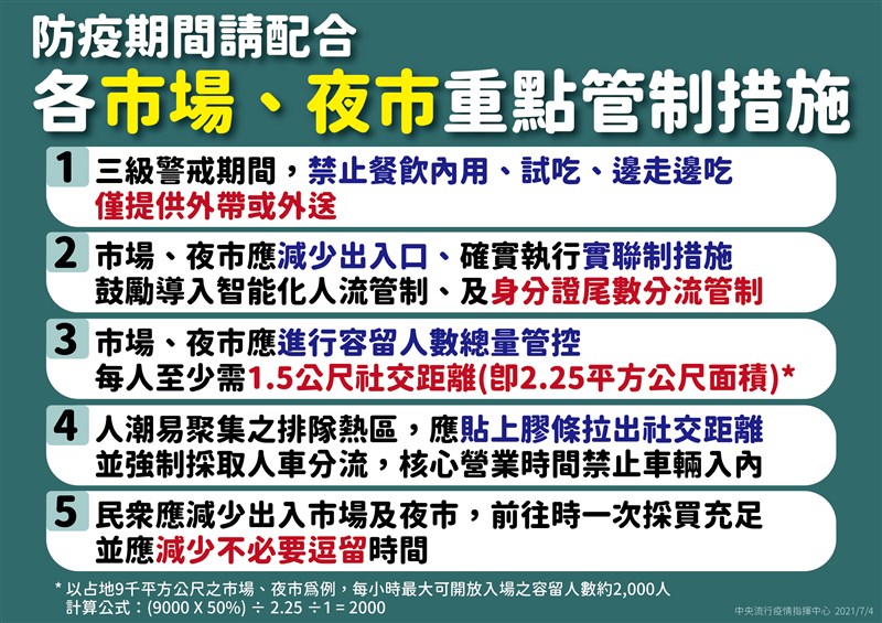 另外,市場、夜市應進行容留人數總量管控每人至少需1.5公尺社交距離,也就是2.25平方公尺面積只能容納一人,以占地9千平方公尺市場、夜市為例,每小時最大可開放入場的容留人數約2000人。