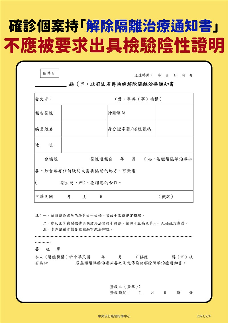 持有「解除隔離通知書」(俗稱的康復證明書)可代替陰性證明。圖/指揮中心提供