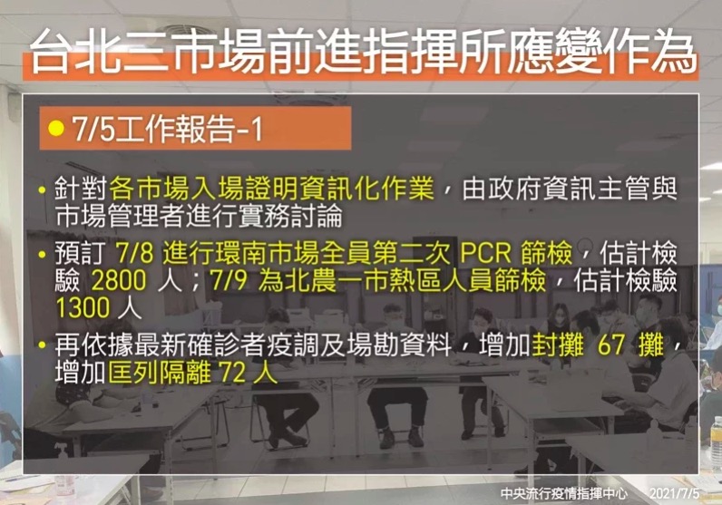 增28例1死! 確診病歿人數新低 群聚案雖多皆為舊案 |2021.07.05 語音朗讀 1833觀看次 字級 大 中 小 北市環南市場、虎林街雖有爆發群聚案,但市場跟地區都不是新案,因此沒有造成確診數暴增,而環南市場也將於明日復市。圖/中央社 【本報台北訊】本土新冠疫情趨緩,中央流行疫情指揮中心今(5)日公布,國內新增28例本土病例及3例境外移入,另新增1例死亡,指揮官陳時中表示,新增的病例數是這波疫情中相對較少的,且整體看來疫情趨勢逐步往下;至於環南市場、北市虎林街爆發群聚,確診數卻沒有飆升,環南市場將於明日復市。陳時中指出,包括台北市的虎林專案,這些市場跟地區都不是新案,3個市場中今天只增加1個新確診者,其餘都舊案。北市三大批發市場群聚感染連環爆,陳時中表示,北市3個市場在6月30日以前就有案例,因此指揮中心每天列出來,讓大家明白群聚的規模以及發展的曲線。目前第一、第二以及環南市場共有232例病例,其中新北有131例、台北有98例,其他地區3例,今天新增1名確診個案於環南市場檢出。至於環南市場將於明日復市,指揮中心也提出6大條件,包括進場查驗PCR陰性證明、固定工作人員必須戴口罩及面罩、降載人流至原先50%、進行各樓層動線分流、各攤位工作者實名登錄以及落實工作人員健康監測。針對接觸者已匡列284名,居家隔離人數共259名,相關接觸者還在持續匡列中,陳時中說:「隨著確診案件減少,希望疫調能更完整將接觸者匡列。」陳時中說,目前增加封攤67攤,增加匡列隔離72人,預訂7月8日進行環南市場全員二次PCR,將檢驗2800人;7月9日針對北農第一市場熱區人員檢驗,估計檢驗1300人。圖/中央社至於北市最近傳出其他的群聚案,如虎林專案中的30名個案。陳時中表示,台北市的虎林專案不是新案,昨天採檢有2個新個案;另外傳出其他區域有群聚,那是過往這些區域中有個案數,發現有聚集的樣貌,因此透過資料研判要擴大篩檢。針對北市長柯文哲說,「沒想到市場傳播比醫院傳播嚴重」的言論,陳時中表示,各種群聚當然值得大家研究,但市場案例並不少見,鄰近國家從最早的市場到冷凍食品等不同類型的傳播都有,相信全球1億多例確診有不同類型,未來都值得探討。 前一篇文章 歌手關詩敏 分享「關在家」素食料理 下一篇文章 南機場某社區傳逾10人確診 里長盼擴大篩檢 熱門新聞 01房市冷 仲介業跨足都更危老整合2026.02.2102動物的精采瞬間(下)2026.02.2203佛光山平安燈會 逾百萬人朝聖2026.02.2304朝山叩鐘 佛光山嶄新大雄寶殿迎春 2026.02.2105【詩】紅豆控的紅龜粿2026.02.2306Q版初代超人力霸王 領航愛河灣2026.02.2107【印象旅人】烘爐地南山福德宮 踏青行2026.02.2108台北道場 新春禮千佛2026.02.2109南投燈會 佛光山鳳凰主燈傳送光明2026.02.2110佛光好市集 職人蔬食、極致咖啡 匯聚佛光大道2026.02.21 訂閱電子報 台北市 天氣預報 台灣一週天氣預報 相關報導 韓:總統願赴立院國情報告金門機場候補數百人 軍機連2天疏運七股科技工業區 招商有成春節連假 海軍維安總統登小雪山拜年 談話聚焦國防經濟蘭嶼巡防艦交船