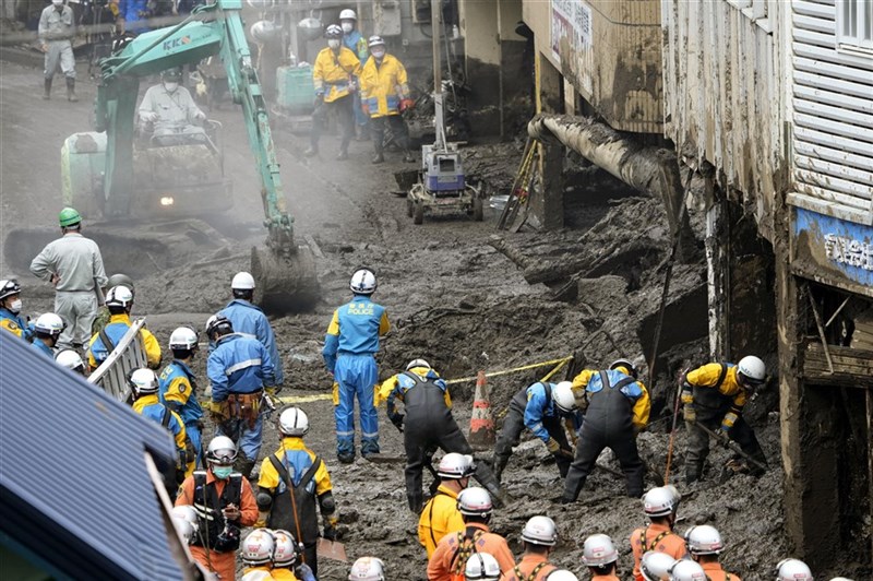 【中央社東京報導】日本靜岡縣熱海市伊豆山地區3日發生大規模土石流已釀4死,救援黃金72小時將至,目前仍有24人失聯待確認;但因梅雨影響,日本氣象廳示警當地仍有可能再度發生土石災害。