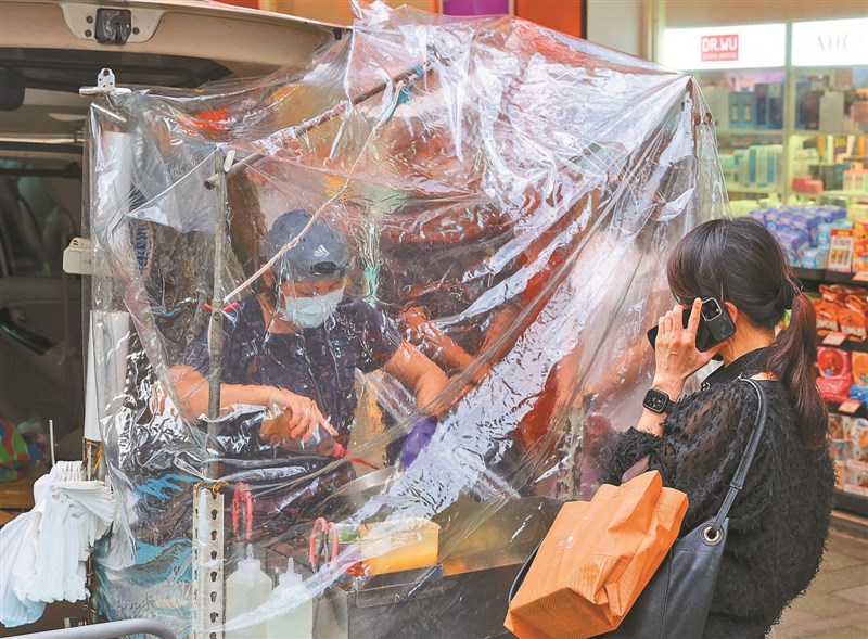 國內疫情尚未退燒,餐飲業受到不小衝擊,街頭小吃攤販因應防疫,將整台餐車包在透明塑膠簾幕中做生意。圖/中央社