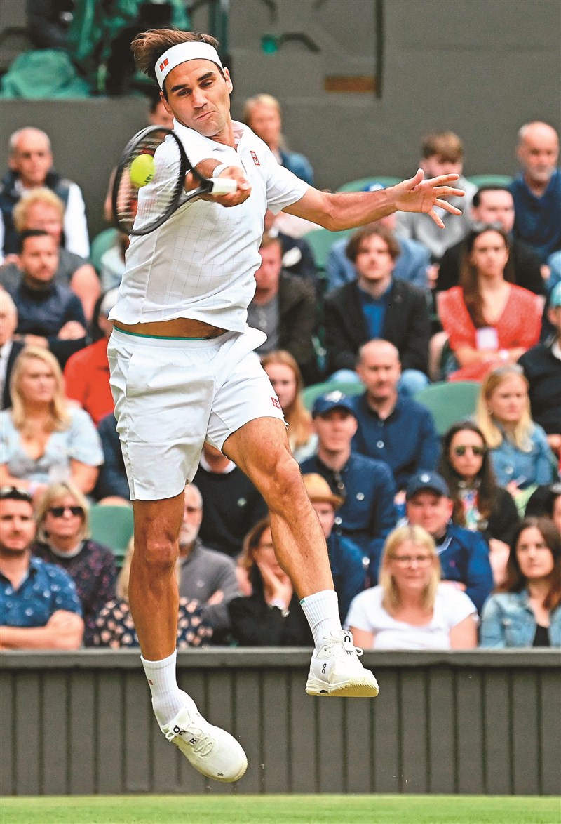 再過5周就年滿40歲,費德勒5日在溫網16強戰,直落三奏捷。圖為他騰身施出一記正手重擊,顯示即使年屆不惑,他的身手仍然不可小覷。圖/法新社