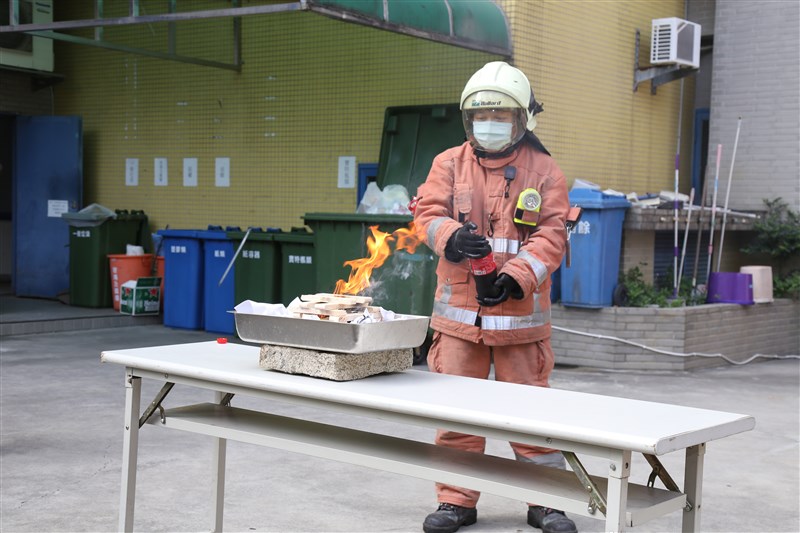 消防員利用各不同品牌可樂與啤酒嘗試滅火,卻發現難以控制噴射的方向,必須進靠火源才得滅火,非常不實用,建議家中仍要準備滅火器以備不時之需。圖/新竹市消防局提供
