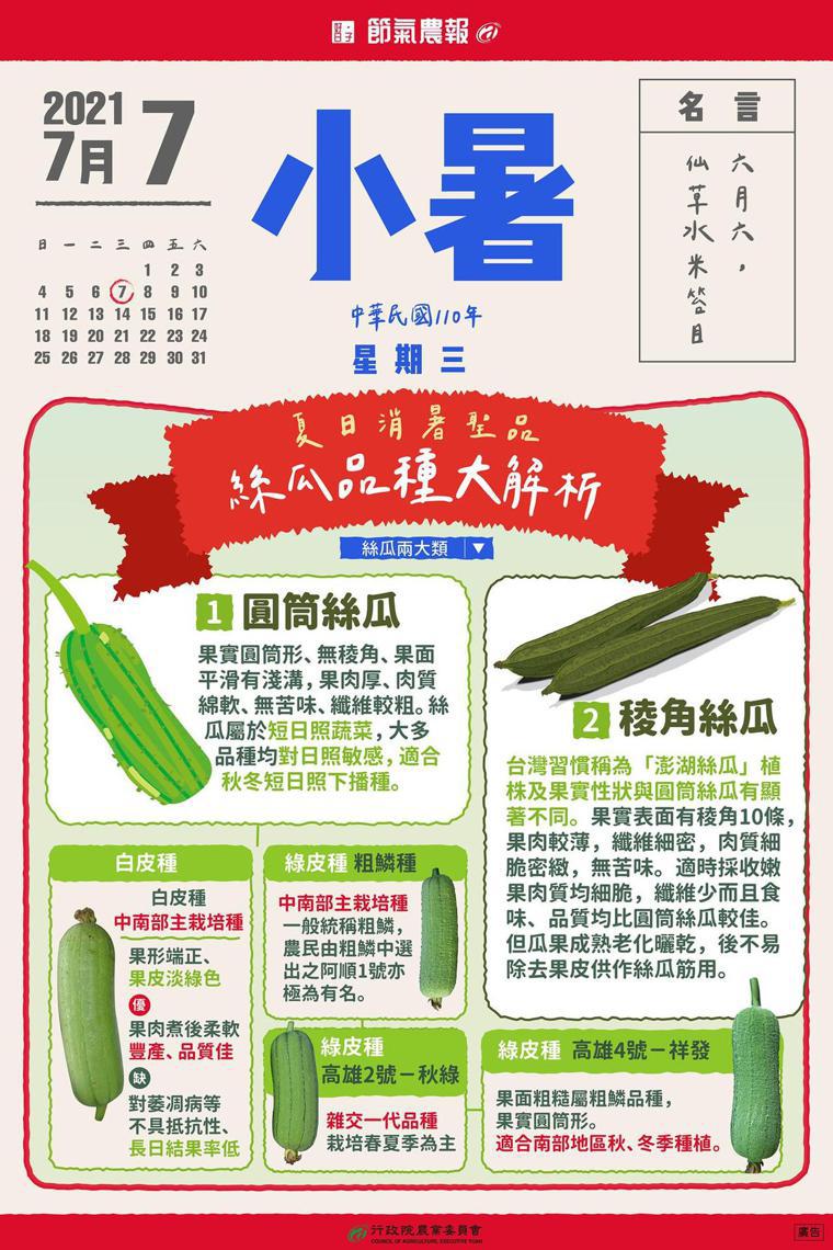 【本報台北訊】天氣愈來愈熱,每天都吃不下東西,是因為24節氣夏季中的「小暑」已到來,有句話說「小暑過,一日熱三分」,意思就是過了小暑,天氣一天比一天還要悶熱。台灣屬亞熱帶氣候,除高溫外亦常伴隨高濕度。營養師建議多吃瓜類可以清熱、利尿、消水腫,非常適合躁熱的夏天吃。行政院農業委員會也建議民眾,小暑就要吃夏日消暑聖品絲瓜!