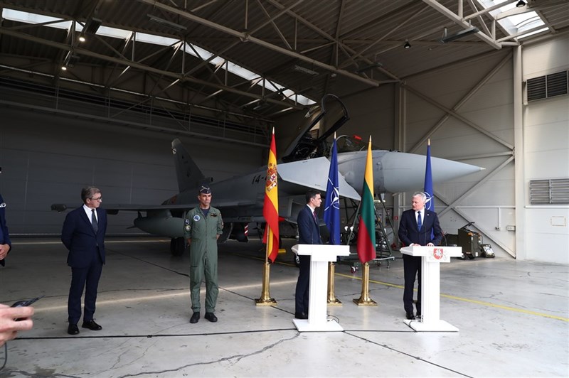 【中央社立陶宛首都維爾紐斯報導】立陶宛總統諾賽達和來訪的西班牙總理桑傑士,今天在一座空軍基地舉行記者會,不料派駐立陶宛兩架西班牙軍機當場緊急出動升空,準備攔截俄羅斯戰機,導致記者會中斷。