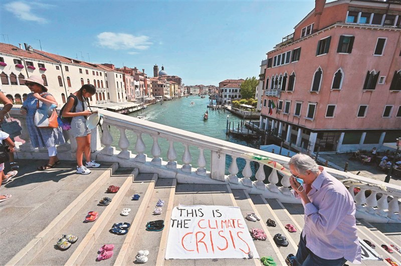G20財長會議十日在義大利威尼斯落幕。圖為環保與社會正義團體十一日在會場邊舉辦集會,擺放多雙鞋子與抗議布條,反對大型郵輪載大量旅客進入威尼斯。圖/法新社