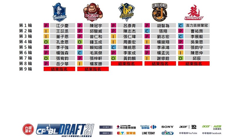 第3順位的中信兄弟、第4位順的統一獅隊及第5順位的味全龍隊各選7輪就放棄指名,兄弟教頭林威助透露,以球隊需求而選,不會為選而選﹔獅隊首輪帶走旅外投手胡智為,接下來捕手張翔及近190公分的左投劉志宏,也都在事前的規畫內。
