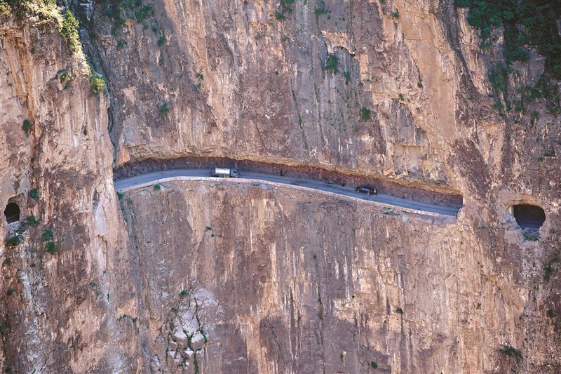 山西省長治市平順縣神龍灣村,位於太行山深處,村民前往縣城,要繞經3省3市4縣8鄉,否則只能攀爬異常陡峭的羊腸小徑。1985年,堪稱「當代愚公」的一群村民自行上山開路,用了15年時間在懸崖絕壁上開出一條長1526公尺的「天路」。路打通後,太行山獨特風韻吸引愈來愈多遊客慕名而來。圖為這條路9日空拍圖。圖/新華社