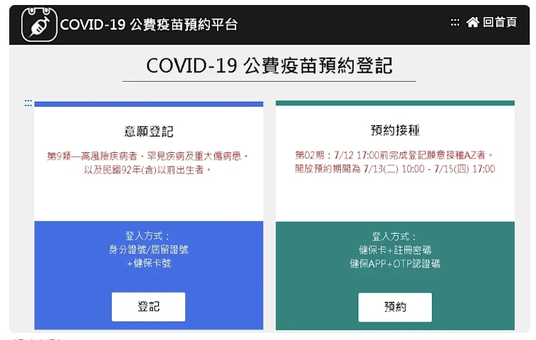 【本報台北訊】國內COVID-19疫苗預約平台意願登記實施對象再擴大,今天(13日)上午開放第9類(18至64歲高風險、罕見疾病及重大傷病者)及民國92年(含)以前出生者意願登記,疫苗種類可以選擇AZ或莫德納,也可以複選。