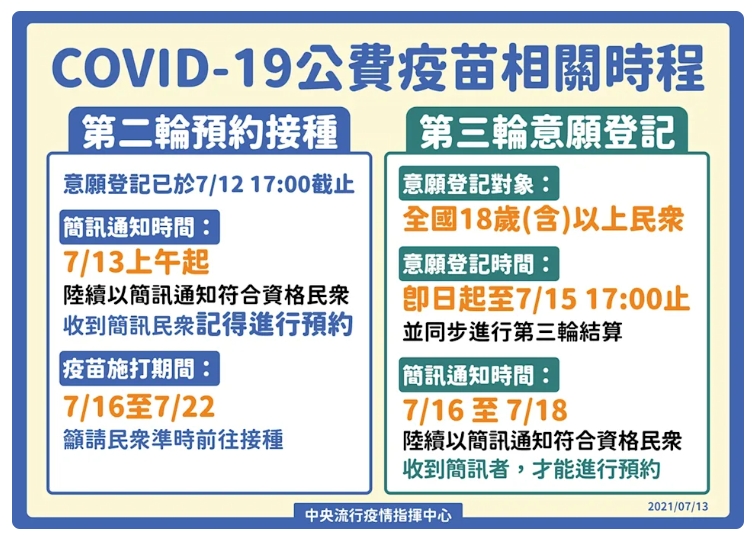 公費疫苗預約 18歲以上開放意願登記 |2021.07.13 語音朗讀 3006觀看次 字級 大 中 小 民眾做好防護施打疫苗。圖╱中央社 【本報台北訊】國內今日新增28例本土確診案例,其中境外移入1例,死亡案例6例。中央流行疫情指揮中心宣布,即起開放18歲(含)以上民眾,於「疫苗施打意願登記與預約系統」進行第3輪意願登記。指揮官陳時中表示,目前居家隔離轉陽性者有11位,據居住縣市來看,新北15例、台北9例、桃園2例、台中1例等,隔離率達84.7%,但案件數需要再調查會比較多。圖/指揮中心為順利推動我國COVID-19疫苗接種作業,開放18歲以上民眾,於「疫苗施打意願登記與預約系統」進行第3輪意願登記,至7月15日17時,並同步進行第3輪結算。再來簡訊通知時間為7月16日至7月18日將陸續以簡訊通知符合資格的民眾;收到簡訊者,才能進行預約,本輪可接種疫苗為AZ疫苗。若有民眾不便使用「COVID-19疫苗施打意願登記與預約系統」,請地方政府設置因地制宜的服務專線或指定人員,協助不便使用系統的民眾進行意願登記。指揮中心進一步表示,第2輪的意願登記已於昨日17時截止,全國約有285萬人登記,其中約114萬人有意願接種AZ疫苗。系統平台將自7月13日上午,陸續以簡訊通知符合資格的民眾,提醒收到簡訊民眾記得進行預約;施打期間為7月16日至7月22日,籲請民眾準時前往接種。但如果只勾莫德納疫苗的民眾是否需要再重新預約?行政院政委唐鳳表示,可在第3輪意願登記時,回網站編輯修改,就能和第3輪一起處理,若第3輪勾的人很多,就按順序排列,第9類以長幼有序規則,其他也是長幼有序排列。另外,不論任何原因,沒收到簡訊,有預約資格但沒預約在期限內,也不用重新登記,下一輪還是有預約資格,還是會收到簡訊,請民眾放心。圖/指揮中心 前一篇文章 民眾搶「18歲以上疫苗預約」不到3小時增300萬人 下一篇文章 指考補救措施公布 考生必須具備4條件 熱門新聞 01MLB太空人打敗洛磯 鄧愷威中繼成功2026.04.1602佛光大佛供奉法華塔與《法華經》信仰意涵2026.04.1203蔬食技巧 不吃肉也能補足蛋白質2026.04.1304澱粉食物 口感變化有祕訣2026.04.1305【深深思念】把悲傷 穿在身上2026.04.1406《浩瀚星雲》大阪海外首演 轟動滿座 2026.04.1407佛光山線上佛學院開學 逾百學員雲端共學2026.04.1508法全票通過 掠奪文物歸還中國2026.04.1709預備檀講師研習 傳播人間佛教正能量2026.04.1410高市國稅局長訪佛光山 認識人間佛教2026.04.13 訂閱電子報 台北市 天氣預報 台灣一週天氣預報 相關報導 美議員籲立院 通過國防預算恢復兩岸航點 陸委會:無迫切必要跨域載具AI智慧安全系統 亮相3展聯合開幕 聚焦電動、氫能車賴總統4月22日出訪史瓦帝尼大型建案強制裝光電 藍提案喊卡