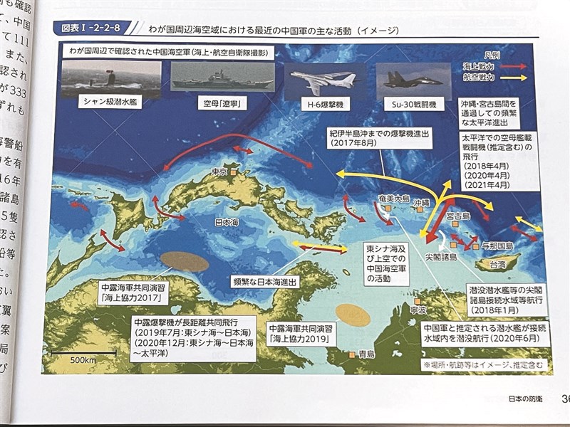 日本最新版本防衛白皮書指出,台灣局勢安定對日本安全保障及國際社會穩定非常重要,日本必須抱持緊張感,密切關注。圖/中央社